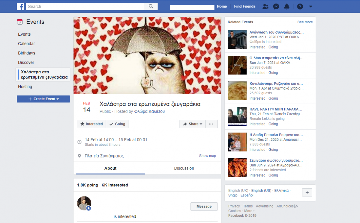 Με χιούμορ αντιμετωπίζουν χρήστες των social media την γιορτή του Αγίου Βαλεντίνου, διοργανώνοντας ένα event στο Facebook με το οποίο υπόσχονται να κάνουν «χαλάστρα» στα ζευγαράκια που θα χαριεντίζονται «ανεξέλεγκτα» στο Σύνταγμα.
