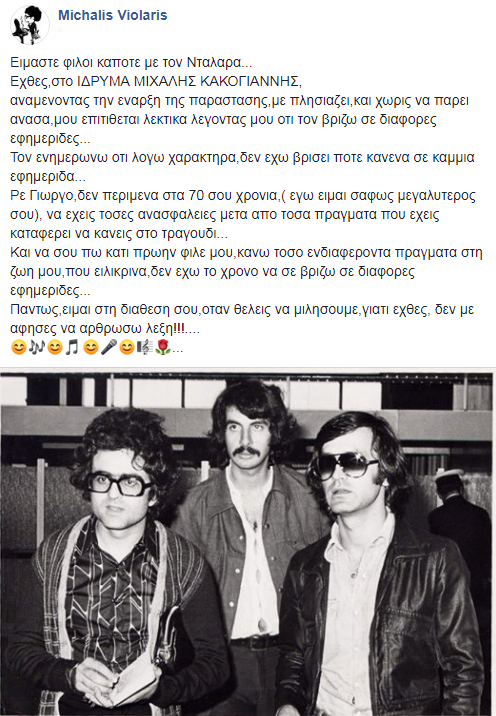 Δεν μπορούσε να κρύψει τον εκνευρισμό του κατά του Γιώργου Νταλάρα ο γνωστός τραγουδιστής Μιχάλης Βιολάρης, ο οποίος και έδωσε απάντηση μέσω Facebook.