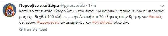 Κατά το τελευταίο 12ωρο λόγω τον έντονων καιρικών φαινομένων, η Πυροσβεστική έχει δεχθεί 100 κλήσεις στην Αττική και 70 κλήσεις στην Κρήτη, για κοπές δέντρων, αφαιρέσεις αντικειμένων και αντλήσεις υδάτων.