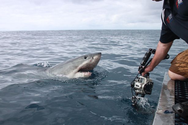 Οι απίστευτες εικόνες δείχνουν ότι το μεγάλο αρπακτικό να βγαίνει από το νερό και να κολυμπάει για να δει τη φωτογραφική μηχανή του φωτογράφου.