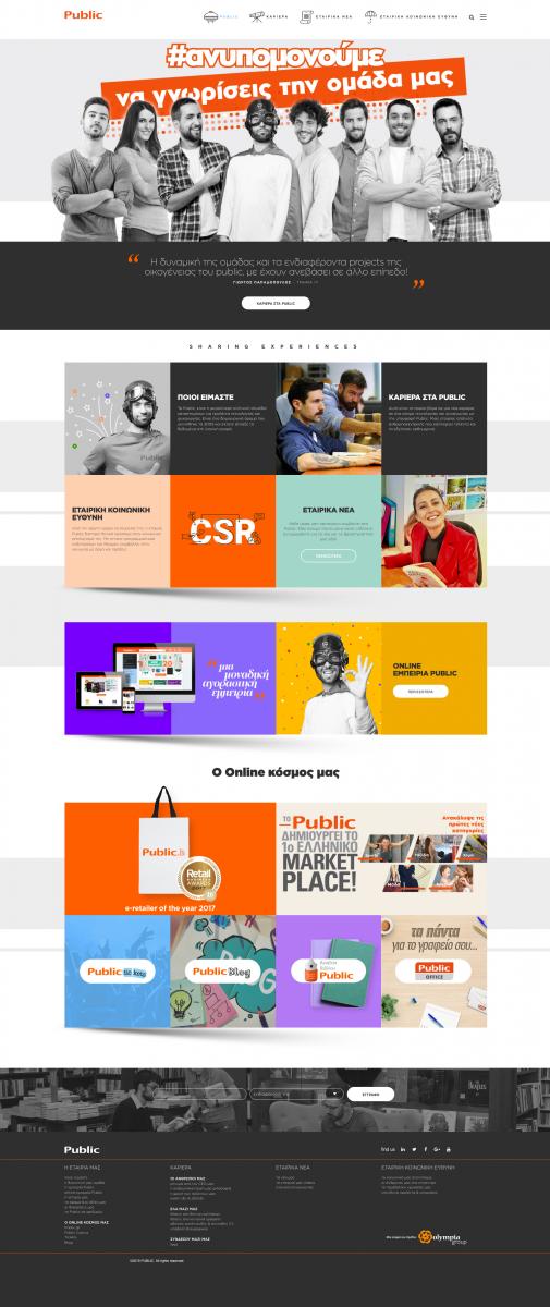 Στο νέο Public corporate site, ο επισκέπτης μπορεί να γνωρίσει τις αξίες, το όραμα, την ιστορία και τις διακρίσεις της εταιρίας, καθώς επίσης να ανακαλύψει μέσα από εντυπωσιακά αριθμητικά στοιχεία πώς τα 55 καταστήματα Public και το public.gr έχουν αναδειχθεί σε κυρίαρχους προορισμούς για προϊόντα και υπηρεσίες τεχνολογίας και ψυχαγωγίας στην ελληνική και κυπριακή αγορά.