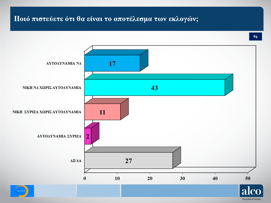 Στις 5,7 εκατοστιαίες μονάδες προσδιορίζει τη διαφορά που χωρίζει τη ΝΔ από τον ΣΥΡΙΖΑ νέα δημοσκόπηση της ALCO που πραγματοποιήθηκε για λογαριασμό του Open TV.