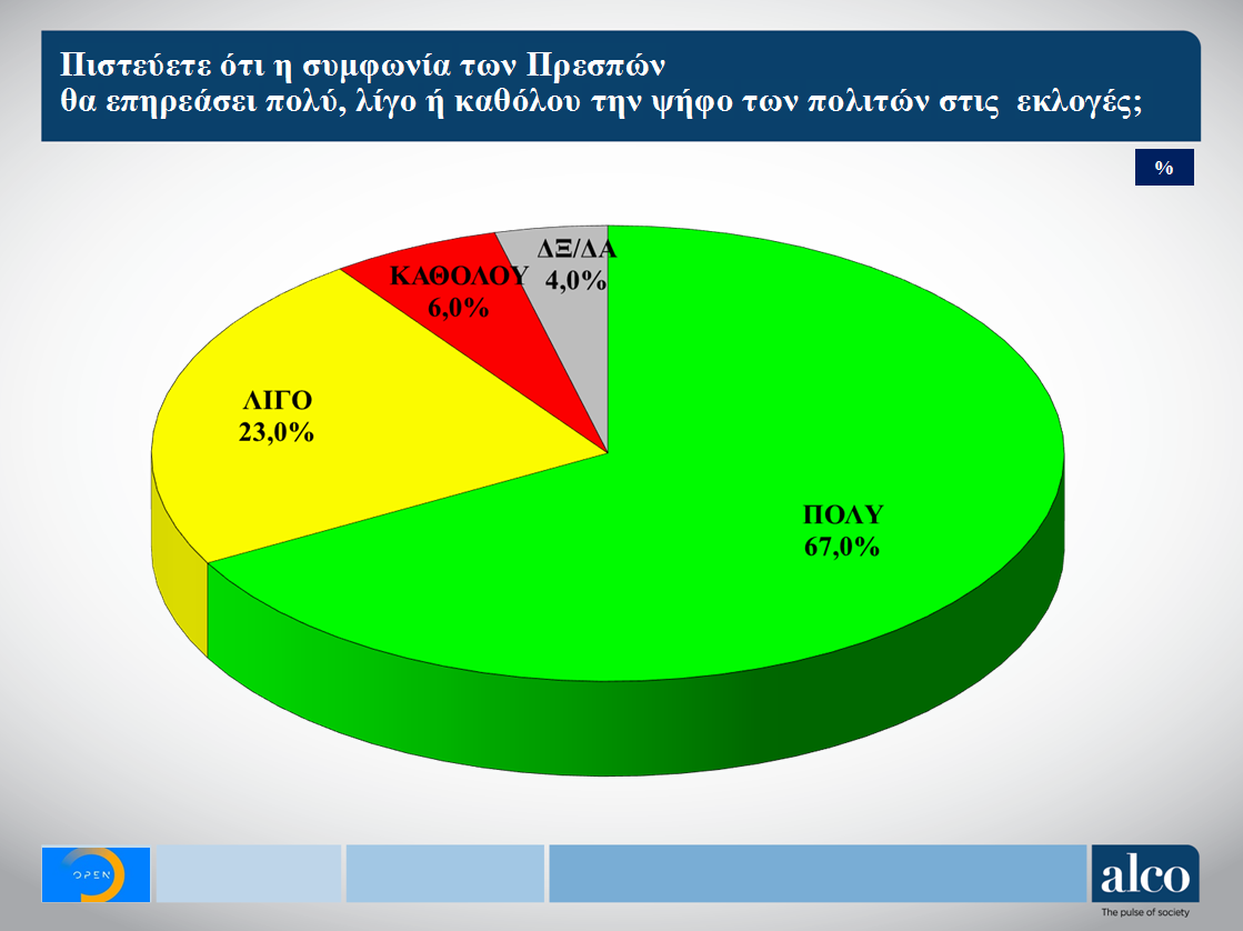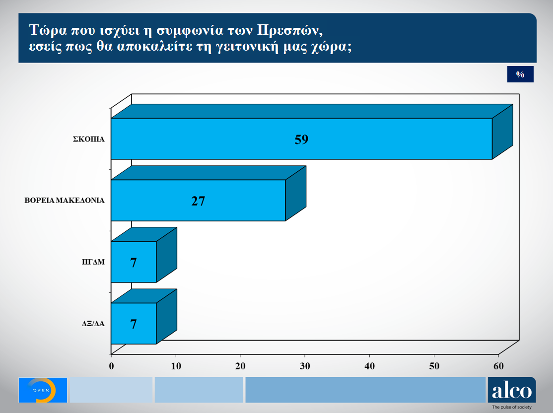 Σχετικά με τη συμφωνία των Πρεσπών, φαίνεται ότι συνεχίζει να προκαλεί εντάσεις, καθώς το 59% δηλώνει ότι θα αποκαλεί τη γείτονα χώρα «Σκόπια», και μόλις το 27% «Βόρεια Μακεδονία», ενώ το 67% θεωρεί ότι η συμφωνία θα βαρύνει σημαντικά στην ψήφο των εθνικών εκλογών, έναντι μόνο 29% που θεωρεί ότι θα επιδράσει από λίγο έως καθόλου.