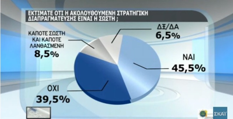 Σε ερώτηση για το ποιο από τα κόμματα έχει τη μεγαλύτερη ευθύνη για το μη ικανοποιητικό πολιτικό κλίμα, το 35% απάντησε ο ΣΥΡΙΖΑ, το 25% όλα τα κόμματα, το 21% και τα δύο μεγάλα κόμματα, το 12% η Νέα Δημοκρατία, το 6% κάποια από τα κόμματα της υπόλοιπης αντιπολίτευσης και το 1% δεν ξέρει/δεν απαντά.