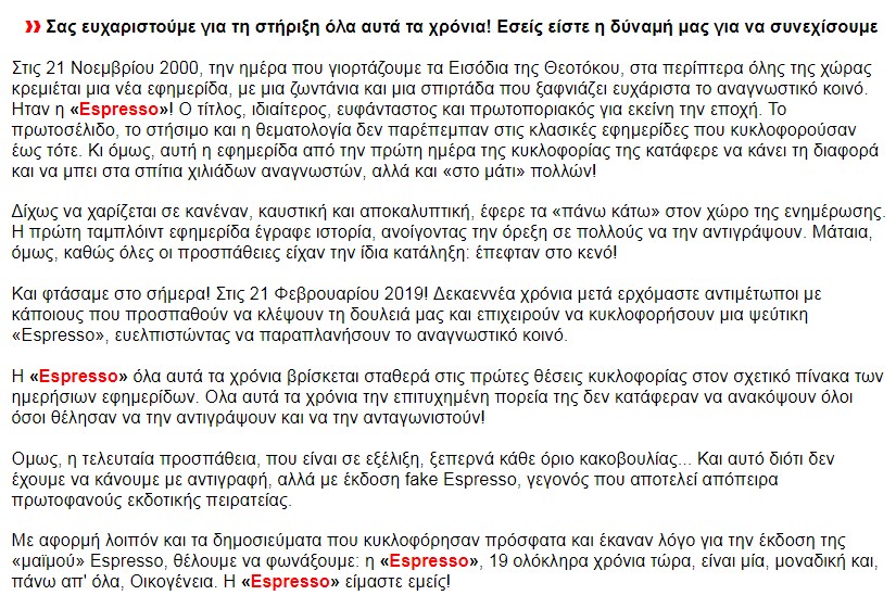 Ο εκδότης των εφημερίδων Δημοκρατία, Εστία και Espresso, Ιωάννης Φιλιππάκης, σε επιστολή του προς τους άλλους εκδότες, μέλη της Ενωσης Ιδιοκτητών Ημερησιων Εφημερίδων Αθηνών (ΕΙΗΕΑ), αναφέρεται σε «προσπάθεια εκδόσεως fake ESPRESSO» που «αποτελεί απόπειρα πρωτοφανούς εκδοτικής πειρατείας».