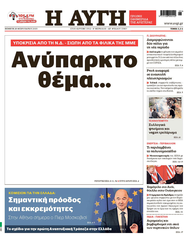 Σε αυτήν τη γραμμή είναι και το σημερινό πρωτοσέλιδο της εφημερίδας «Αυγή», που κυκλοφόρησε με λευκή… τρύπα.