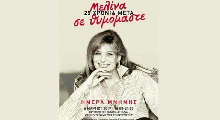 Οι εκδηλώσεις με τίτλο «25 χρόνια μετά, Μελίνα σε θυμόμαστε» ξεκινούν σήμερα Τετάρτη 6 Μαρτίου με την προβολή της ταινίας «Στέλλα» και συζήτηση με τους «κοντινούς της ανθρώπους», τους συνεργάτες της Μανουέλα Παυλίδου, Χριστόφορο Αργυρόπουλο, Μάνο Ζαχαρία και Στέλλα Χρυσουλάκη. Η εκδήλωση θα πραγματοποιηθεί από 18:00-21:00 στην Ταινιοθήκη της Ελλάδας (Ιερά Οδός 48 & Μεγ. Αλεξάνδρου 134-136).