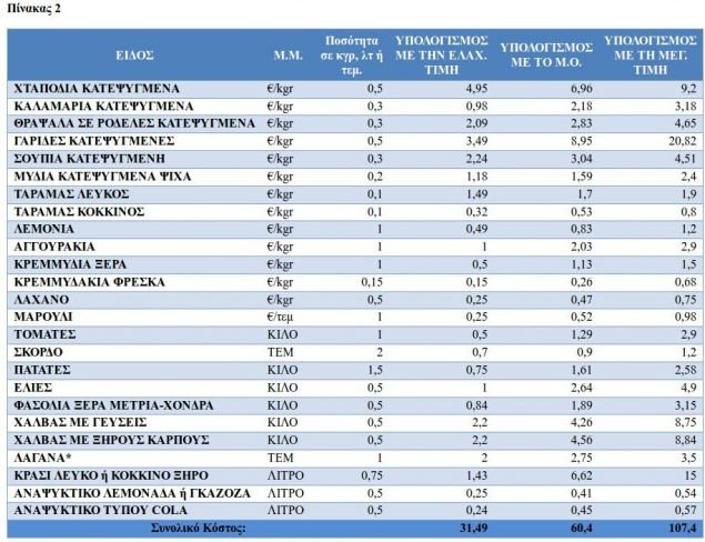 Σημειώνουμε ότι οι τιμές της λαγάνας αφορούν, προφανώς, εκτιμήσεις και όχι πραγματικές τιμές. Επίσης αναφέρουμε ότι στο καλάθι κατηγοριοποιήσαμε τα είδη για λόγους εύληπτης κατανόησης των αποτελεσμάτων.