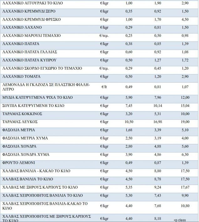 Στα ίδια επίπεδα κυμαίνεται η τιμή του χαλβά. Στον παρακάτω πίνακα παρουσιάζονται τα είδη κατά κατηγορία και οι αυξομειώσεις σε σχέση με την αντίστοιχη περσινή περίοδο. Διευκρινίζουμε ότι κατά την περσινή περίοδο δεν παρακολουθούσαμε την εξέλιξη των τιμών όλων των ειδών του καλαθιού (κρασιά, αναψυκτικά κλπ).