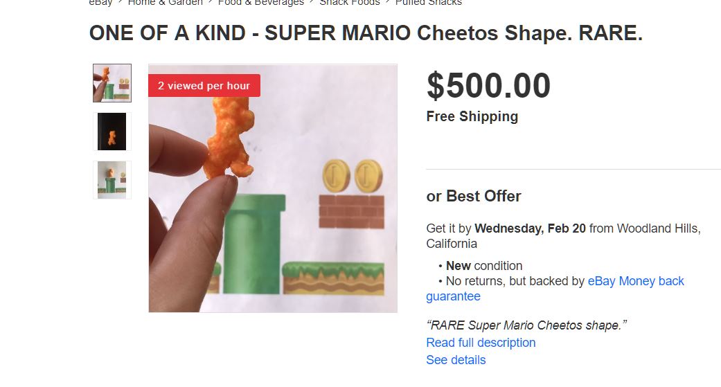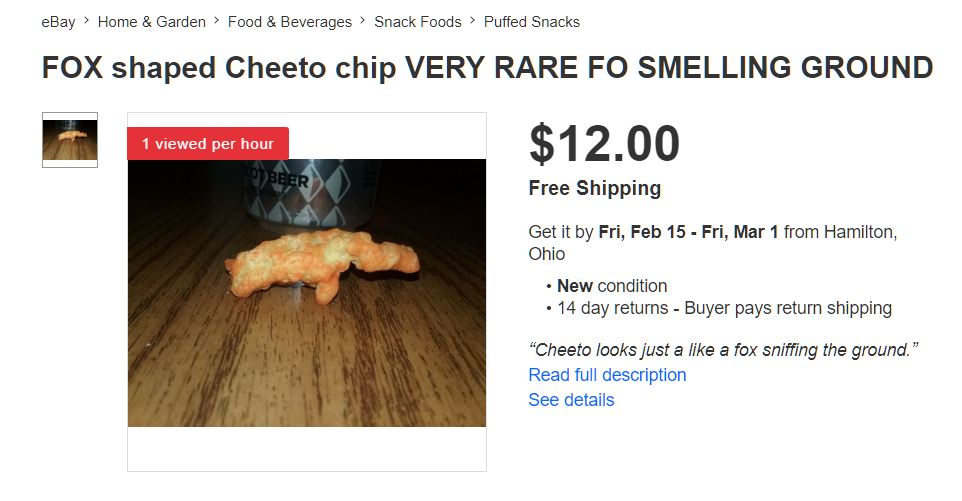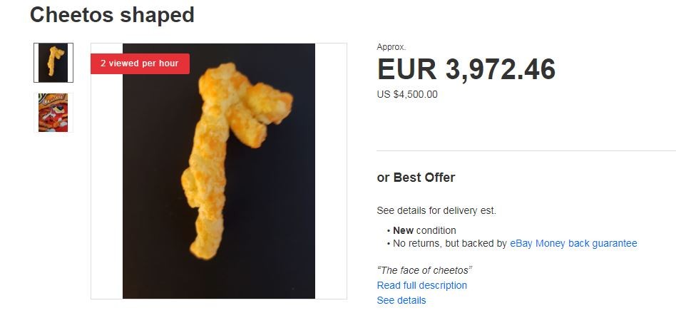Χρήστες του e-bay έχουν κάνει χιλιάδες αναρτήσεις στην πλατφόρμα για να πουλήσουν γαριδάκια σε παράξενα σχήματα όπως ένα που έμοιαζε με τη μασκότ των Cheetos, τον Chester, το οποίο πωλείται στην τιμή των 4.000 ευρώ περίπου.