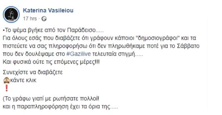 «Το ψέμα βγήκε από τον Παράδεισο…..Για όλους εσάς που διαβάζετε ότι γράφουν κάποιοι «δημοσιογράφοι» και τα πιστεύετε να σας πληροφορήσω ότι δεν πληρωθήκαμε ποτέ για το Σάββατο που δεν δουλέψαμε στο #Gazilive τελευταία στιγμή…..Και φυσικά ούτε τις επόμενες μέρες!!! (Το γράφω γιατί με ρωτήσατε πολλοί! Και η παραπληροφόρηση έχει τα όρια της…)» έγραψε.