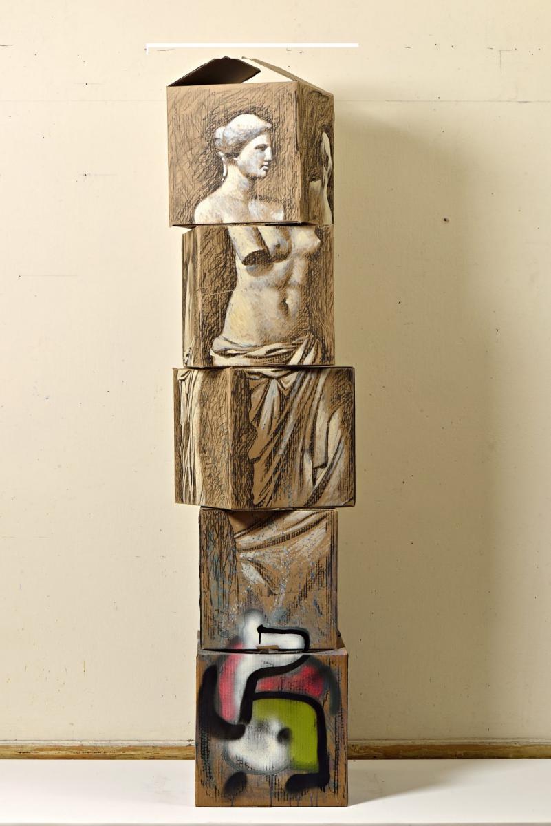 «Το αρχαίο έχει τόσο πολύ μπει μέσα στην ψυχή μας, που μόλις το σκεφτούμε μπορεί να το δούμε παντού» εξηγεί στο ΑΠΕ-ΜΠΕ, αναφερόμενος, για παράδειγμα, στα δυο φτερά από ένα smart όπου ζωγράφισε αρχαιότητες ή στο μικρό κομμάτι αυτοκινήτου που βρήκε μετά από τρακάρισμα, πάνω στο οποίο φιλοτέχνησε τον Όμηρο. «Δεν είχα σκοπό να κάνω γλυπτό, ήθελα απλώς την ιδέα, όπως με τις πέτρες» συμπληρώνει. «Είχα κάνει μια έκθεση στη Λήμνο και τα έργα επιστράφηκαν μέσα σε μια κούτα» συνεχίζει. «Την ώρα που τα έβγαζα και ήμουν έτοιμος να πετάξω την κούτα, άρχισα να τη ζωγραφίζω. Έτσι βγήκε το πρώτο έργο». Και γιατί επέμεινε στο χαρτόνι; «Έβλεπα όλους αυτούς τους ανθρώπους που περνάνε και πνίγονται, έρχονται στη Σάμο και βάζουν κάτω χαρτόνια για να κοιμηθούν. Το χαρτόνι είναι πια ένα θέμα, είναι ένα υλικό. Ζει ο κόσμος μέσα στα χαρτόνια. Έχει σημασία αυτό. Έκανα έργα πάνω σε τελάρα, αλλά γινόταν μουσαμάς. Δεν είχε αυτό το ”πάνω στο σκουπίδι κάνεις τον θεό σου”», λέει χαρακτηριστικά.