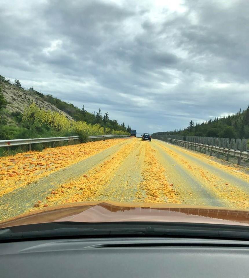 Σύμφωνα με τα πρώτα στοιχεία, το φορτηγό που μετέφερε τα φρούτα υπέστη ζημιά στην καρότσα, η οποία άνοιξε, με αποτέλεσμα να πέσουν στο δρόμο.