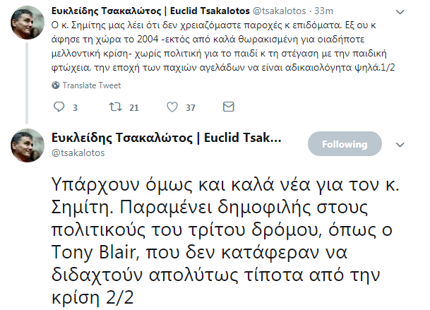 Ο κ. Τσακαλώτος έγραψε χαρακτηριστικά: «Ο κ. Σημίτης μας λέει ότι δεν χρειαζόμαστε παροχές κ επιδόματα. Εξ ου κ άφησε τη χώρα το 2004 -εκτός από καλά θωρακισμένη για οιαδήποτε μελλοντική κρίση- χωρίς πολιτική για το παιδί κ τη στέγαση με την παιδική φτώχεια, την εποχή των παχιών αγελάδων να είναι αδικαιολόγητα ψηλά. Υπάρχουν όμως και καλά νέα για τον κ. Σημίτη. Παραμένει δημοφιλής στους πολιτικούς του τρίτου δρόμου, όπως ο Τony Blair, που δεν κατάφεραν να διδαχτούν απολύτως τίποτα από την κρίση».