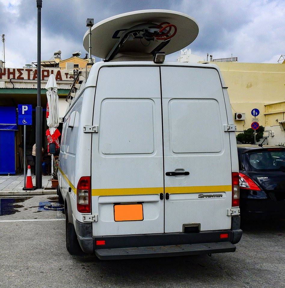 Όπως φαίνεται στις φωτογραφίες, το βαν του τηλεοπτικού σταθμού ήταν παράνομα σταθμευμένο σε αναπηρικό θέση στην πλατεία Κανάρη, στην Ερμούπολη.