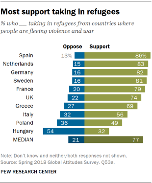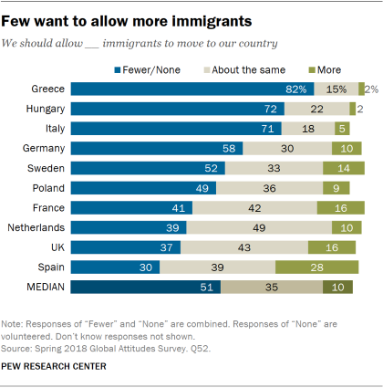 Συγκεκριμένα, σύμφωνα με τα στοιχεία της έρευνας, το 82% των Ελλήνων θέλει στη χώρα να έρχονται λιγότεροι ή και καθόλου μετανάστες, κατέχοντας την κορυφή των αρνητικών απόψεων, με την Ουγγαρία να ακολουθεί με 72% και την Ιταλία με 71%.