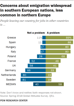 Επίσης, το 89% των Ελλήνων αντιτίθεται στη μετανάστευση για ευκαιρίες δουλειές. Πάντως, η εικόνα διαφοροποιείται όσον αφορά στους πρόσφυγες, καθώς το 69% των Ελλήνων τάσσεται υπέρ της υποδοχής προσφύγων από εμπόλεμες περιοχές,.