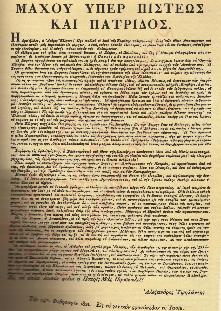 Ἡ ὥρα ἦλθεν, ὦ Ἄνδρες Ἕλληνες! Πρὸ πολλοῦ οἱ λαοὶ τῆς Εὐρώπης, πολεμοῦντες ὑπὲρ τῶν ἰδίων Δικαιωμάτων καὶ ἐλευθερίας αὐτῶν, μᾶς ἐπροσκάλουν εἰς μίμησιν, αὐτοί, καίτοι ὁπωσοῦν ἐλεύθεροι, ἐπροσπάθησαν ὅλαις δυνάμεσι νὰ αὐξήσωσι τὴν ἐλευθερίαν, καὶ δι’ αὐτῆς πᾶσαν αὐτῶν τὴν Εὐδαιμονίαν. […]