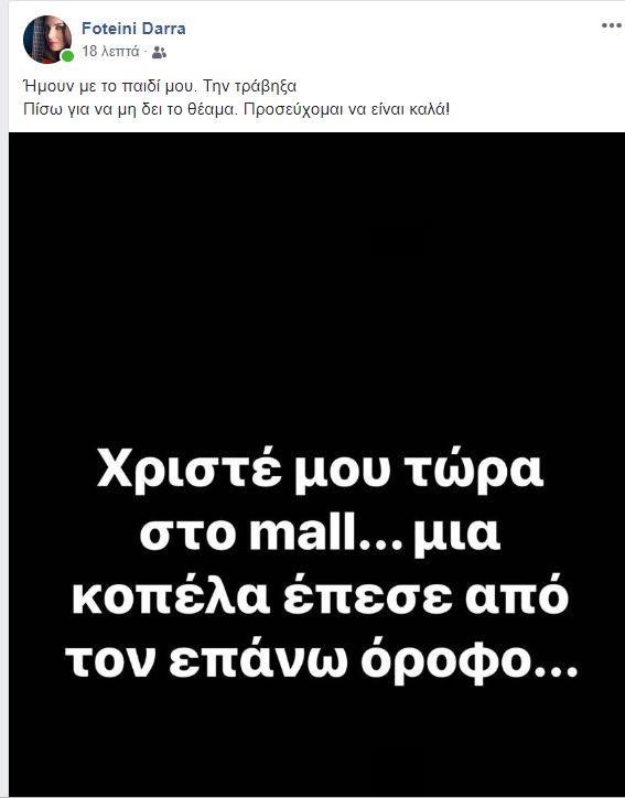 Η Φωτεινή Δάρρα όχι μόνο βρισκόταν στο εμπορικό κέντρο τη στιγμή της πτώσης της γυναίκας από τον 3ο όροφο, αλλά αντέδρασε ακαριαία τραβώντας το παιδί της ώστε να μην αντικρίσει το θέαμα.
