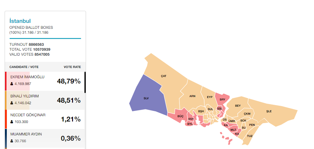 Ο υποψήφιος του κεμαλικού Ρεπουμπλικανικού Κόμματος, Εκρέμ Ιμάμογλου είναι ο νικητής στο «θρίλερ» της Κωνσταντινούπολης, καθώς σύμφωνα με το πρακτορείο Anadolu, έλαβε το 48,79% των ψήφων, έναντι 48,51% του Μπιναλί Γιλντιρίμ.