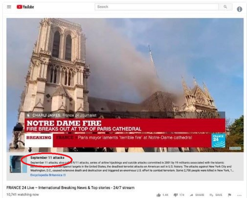 Συγκεκριμένα, το εν λόγω κανάλι στο YouTube μετέδωσε κατά λάθος εικόνες από την πυρκαγιά στην Παναγία των Παρισίων οι οποίες συνοδεύονταν από ενημερωτικό κείμενο από την εγκυκλοπαίδια Britannica, που αφορούσε στις επιθέσεις της 11ης Σεπτεμβρίου του 2001 στις ΗΠΑ.