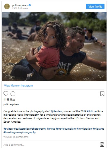 Η διοργάνωση των Βραβείων Πούλιτζερ στο Instagram ανήρτησε στον λογαριασμό της στο Instagram ένα μήνυμα για τους νικητές από το προσωπικό του Reuters. Σύμφωνα με όσα γράφει στην ανάρτησή της, το βραβείο απονεμήθηκε «για τη ζωντανή και εντυπωσιακή οπτική αφήγηση του επείγοντος, της απελπισίας και της θλίψης των μεταναστών, ενώ ταξίδευαν προς τις ΗΠΑ από την Κεντρική και Νότια Αμερική».