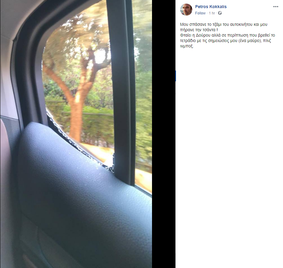 «Μου σπάσανε το τζάμι του αυτοκινήτου και μου πήρανε την τσάντα! Φταίει η Δούρου αλλά σε περίπτωση που βρεθεί το τετράδιο με τις σημειώσεις μου (ένα μαύρο), πλιζ ινμποξ».