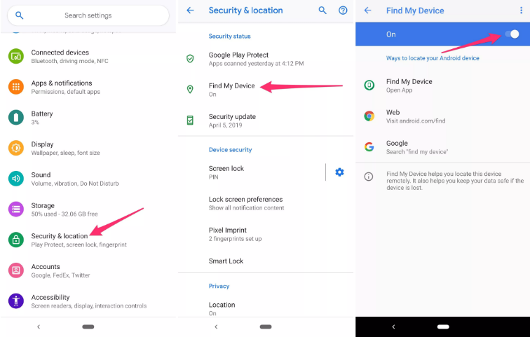 2. Ενεργοποιήστε την εφαρμογή ανεύρεσης: στο Android η Google έχει συμπεριλάβει τη λειτουργία «Find My Device» την οποία θα βρείτε στις ρυθμίσεις, στην Ασφάλεια, και που πρέπει να ενεργοποιήσετε, μαζί με την Τοποθεσία.