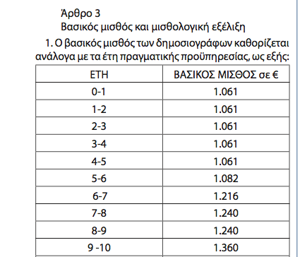 Η μισθολογική αλλαγή αφορά στο ύψος του πρώτου μισθού που αντί για 870 ευρώ που ήταν στην παλιό ΚΥΑ για τα δυο πρώτα χρόνια, καθορίζεται στα 1061 ευρώ μεικτά για πέντε χρόνια. Η 2ετία δηλαδή της αύξηση μισθού θα υπολογίζεται για τους δημοσιογράφους στα δημόσια ΜΜΕ από τον 5ο χρόνο και μετά. Κατά τα άλλα η ΚΥΑ επαναλαμβάνει τους όρους της προηγούμενης κοινής υπουργικής απόφασης, δηλαδή τα επιδόνατα σπουδών, προϋσταμένων και το οικογενειακό επίδομα, χωρίς ωστόσο αναπροσαρμογές. Δεν γίνεται επίσης καμία αναφορά σε εργασία Κυριακής και αργιών. Στην ουσία συνεχίζεται η εργασιακή κατοχύρωση των δημοσιογράφων στα δημόσια ΜΜΕ με υπουργικές αποφάσεις και όχι με Συλλογική σύμβαση εργασίας, όπως ήταν το αίτημα των εργαζομένων.