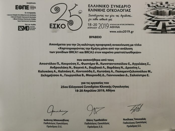 Η εργασία τους, με τίτλο “Χαρτογραφώντας την Κρήτη μέσα από την ανάλυση των γονιδίων BRCA1 και BRCA2 στον καρκίνο μαστού/ωοθηκών” απέσπασε το δεύτερο βραβείο στο 25ο Ελληνικό Συνέδριο Κλινικής Ογκολογίας που διεξήχθη στην Αθήνα στις 18-20 Απριλίου και αλλάζει τα επιστημονικά δεδομένα για την περιοχή μας, καθώς ανοίγει τον δρόμο για την άμεση ανάπτυξη ενός γρήγορου και φθηνού τεστ για όλες τις Χανιώτισσες και τους Χανιώτες.”Για να το καταλάβει κανείς αυτό, αρκεί να σκεφτεί ότι υπάρχουν χιλιάδες μεταλλάξεις του συγκεκριμένου γονιδίου. Από όλες αυτές, το 75% των ασθενών που είχαν κάποια μετάλλαξη των γονιδιών στα Χανιά, είχαν ακριβώς αυτές τις δύο, οι οποίες μάλιστα δεν έχουν περιγραφεί πουθενά αλλού. Γι’ αυτό και τις λέμε ιδρυτικές. Έτσι, μπορεί τώρα να γίνει ένα τέτοιο πρόγραμμα ελέγχου, γρήγορο και φθηνό. Τώρα, η πλήρης εξέταση για να ελέγξεις όλο το γονιδίωμα θέλει πολύ χρόνο και στοιχίζει γύρω στα 800 με 1000 ευρώ ενώ αυτό θα κάνει λιγότερα από 100 ευρώ και τα αποτελέσματα θα βγαίνουν σε λίγες ημέρες” τονίζει στο zarpanews.gr ο κ. Κουρούσης.
