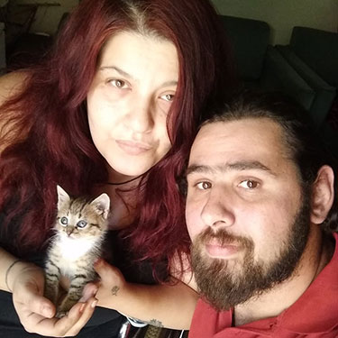 Ο Παναγιώτης Κατσιμπίρης και η σύζυγός του, δεν χρειάστηκε να το σκεφθούν πολύ. Όταν ξεγέννησε ο σκύλος τους, πήραν μαζί με τα νεογέννητα κουτάβια και το τραυματισμένο τιγρέ γατάκι.
