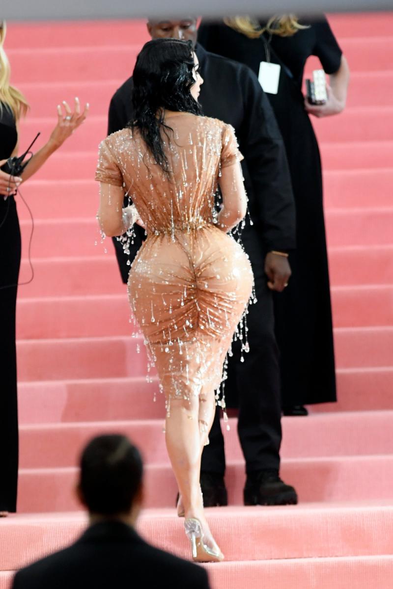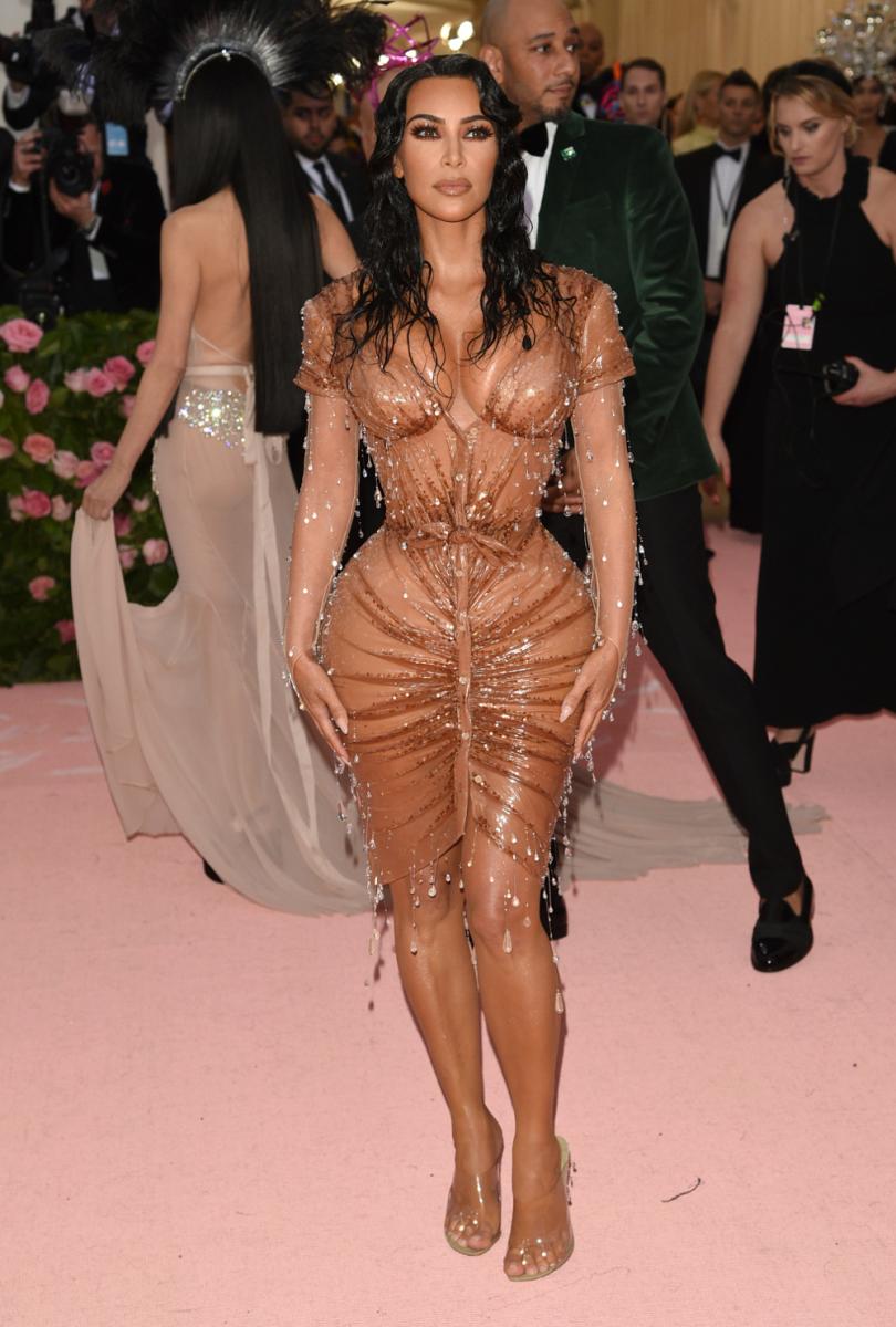 Η ετεροθαλής αδερφή τους, Κιμ Καρντάσιαν-Γουέστ επέλεξε να περπατήσει στο κόκκινο χαλί με βρεγμένο διάφανο look με ένα φόρεμα έως το γόνατο σε ουδέτερη απόχρωση και βαθύ ντεκολτέ.