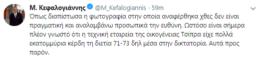 «Όπως διαπίστωσα, η φωτογραφία στην οποία αναφέρθηκα χθες δεν είναι πραγματική, και αναλαμβάνω προσωπικά την ευθύνη. Ωστόσο είναι σήμερα πλέον γνωστό, ότι η τεχνική εταιρεία της οικογένειας Τσίπρα είχε πολλά εκατομμύρια κέρδη τη διετία 71-73 δηλ. μέσα στην δικτατορία. Αυτά προς παρόν» έγραψε σε ανάρτησή του στο τουίτερ ο ευρωβουλευτής της ΝΔ, Μανώλης Κεφαλογιάννης.