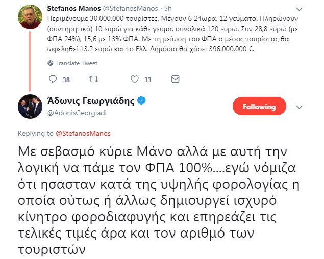 Ο υπολογισμός του κ. Μάνου δεν… άρεσε στον κ. Γεωργιάδη, ο οποίος σχολίασε: «Με σεβασμό κύριε Μάνο αλλά με αυτή την λογική να πάμε τον ΦΠΑ 100%….εγώ νόμιζα ότι ησασταν κατά της υψηλής φορολογίας η οποία ούτως ή άλλως δημιουργεί ισχυρό κίνητρο φοροδιαφυγής και επηρεάζει τις τελικές τιμές άρα και τον αριθμό των τουριστών».