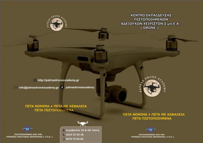 Σύμφωνα με το tempo24.news, η Patras Drone Academy είναι μια νέα, πιστοποιημένη ακαδημία στην Πάτρα, που δημιουργήθηκε για να προσφέρει σύγχρονες υπηρεσίες επαγγελματικής & ερασιτεχνικής εκπαίδευσης στα Συστήματα μη Επανδρωμένων Αεροσκαφών (ΣμηΕΑ), χειριστές drone.