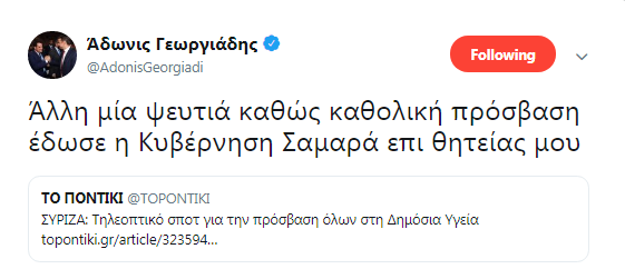 Συγκεκριμένα ο κ. Γεωργιάδης έγραψε: «Άλλη μία ψευτιά καθώς καθολική πρόσβαση έδωσε η Κυβέρνηση Σαμαρά επί θητείας μου».
