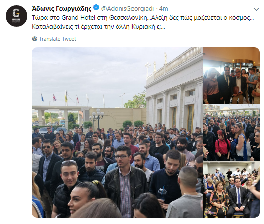 Σε τουίτ που ανέβασε με φωτογραφίες από το πολυπληθές κοινό στη συγκέντρωση σε κεντρικό ξενοδοχείο στη Θεσσαλονίκη, ο κ. Γεωργιάδης έγραψε: