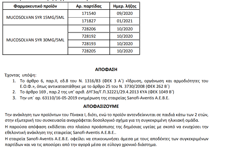 Την ανάκληση του γνωστού φαρμάκου Mucosolvan καθώς σε αυτά αναγράφονται λάθος ενδείξεις για τη χορήγηση σε παιδιά. «Ενώ το προϊόν αντενδείκνυται σε παιδιά κάτω των 2 ετών, στην εξωτερική του συσκευασία αναγράφεται δοσολογικό σχήμα για τη συγκεκριμένη ηλικιακή ομάδα», αναφέρεται στην ανακοίνωση.