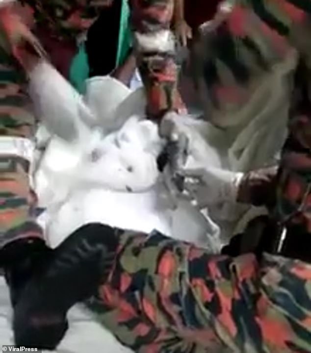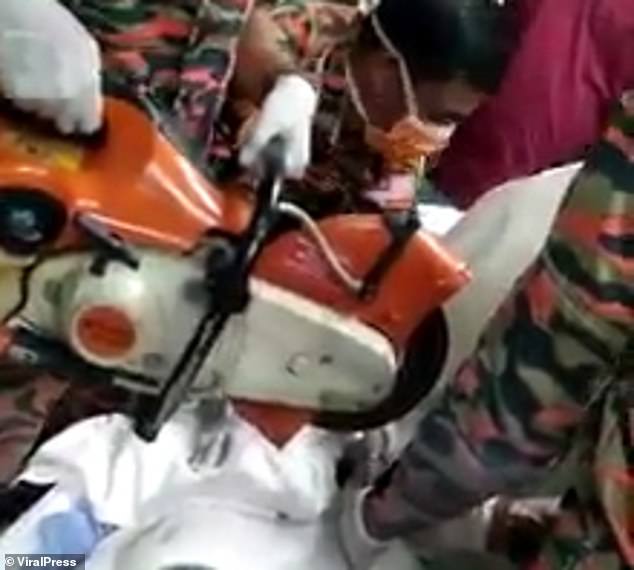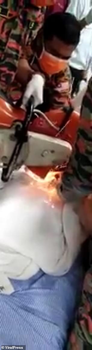 Εκεί οι γιατροί του χορήγησαν φάρμακα και οι πυροσβέστες που ακολούθησαν με ένα σιδεροπρίονο ξεκίνησαν να κόβουν τη μεταλλική μέγγενη.