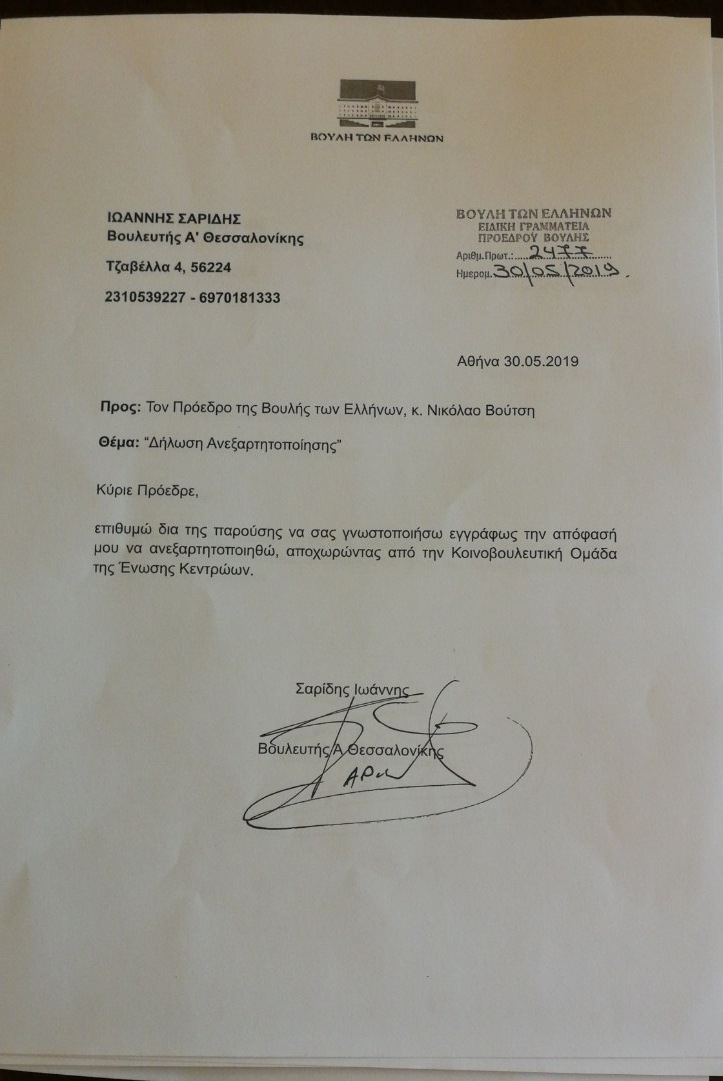 Χωρίς κοινοβουλευτική ομάδα μένει πλέον η Ένωση Κεντρώων, μετά την ανεξαρτητοποίηση του βουλευτή Γιάννη Σαρίδη, το πρωί της Πέμπτης.