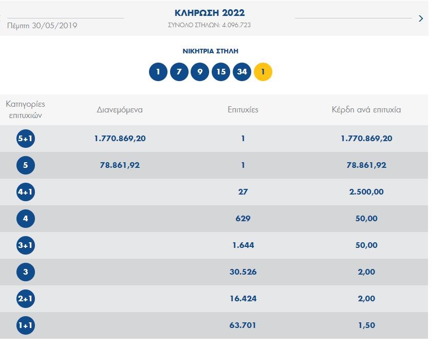 Οι αριθμοί που κληρώθηκαν είναι: 9, 7, 1, 34, 15 και Τζόκερ ο αριθμός 1.
