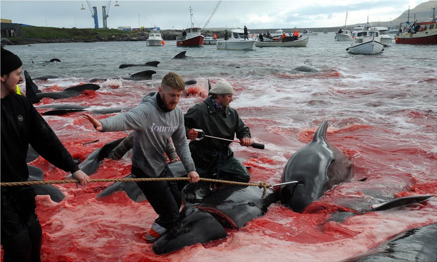 Νωρίτερα άλλοι ψαράδες είχαν φροντίσει να οδηγήσουν με τα πλοία τους τις φάλαινες και τα δελφίνια στον κόλπο της πόλης Τορσχαβν, της πρωτεύουσας ενός εκ των νησιών.