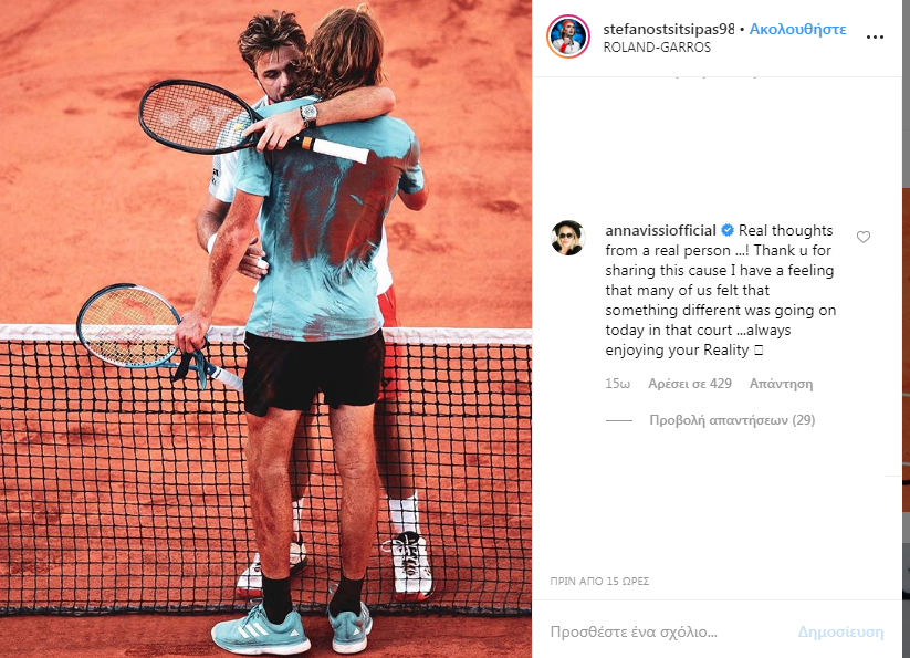 Μεταξύ αυτών και η Άννα Βίσση. «Αληθινές σκέψεις από έναν αληθινό άνθρωπο. Ευχαριστώ που το μοιράστηκες αυτό, γιατί νιώθω ότι πολλοί από εμάς αισθανθήκαμε ότι κάτι διαφορετικό συνέβη σήμερα στο κορτ… πάντα να απολαμβάνεις την πραγματικότητα σου», ήταν το σχόλιο της τραγουδίστριας.
