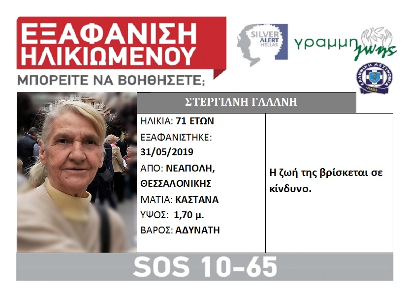 Θρίλερ στη Θεσσαλονίκη καθώς η 71χρονη Στεργιανή Γαλάνη αγνοείται από το απόγευμα της Παρασκευής 31 Μαΐου, από το σπίτι της στη Νεάπολη.