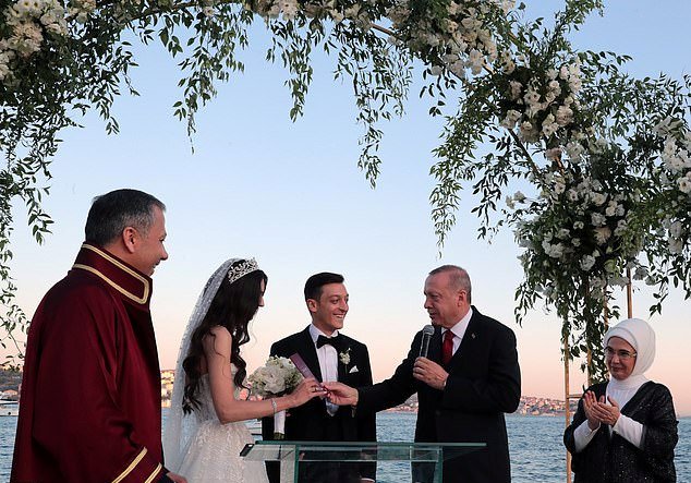 Η αυτοκινητοπομπή του Τούρκου προέδρου έφτασε αργά το απόγευμα στο πολυτελές ξενοδοχείο, στις όχθες του Βοσπόρου, όπου ο σταρ της Άρσεναλ γιόρταζε την ένωσή του με την Γκιουλσέ, όπως ανέφεραν ανταποκριτές του Γαλλικού Πρακτορείου. Λίγο αργότερα, ο Ερντογάν και η σύζυγός του, η Εμινέ, εθεάθησαν να στέκουν χαμογελαστοί δίπλα στο ζευγάρι ενώ ένας αξιωματούχος, ντυμένος στα κόκκινα, τελούσε τον γάμο.