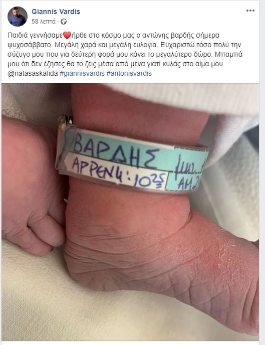 Όπως έγραψε ο Γιάννης Βαρδής στο facebook: “Παιδιά γεννήσαμε, ήρθε στο κόσμο μας ο αντώνης βαρδής σήμερα ψυχοσάββατο. Μεγάλη χαρά και μεγάλη ευλογία. Ευχαριστώ τόσο πολύ τη σύζυγό μου που για δεύτερη φορά μου κάνει το μεγαλύτερο δώρο. Μπαμπά μου ό,τι δεν έζησες θα το ζεις μέσα από μένα γιατί κυλάς στο αίμα μου”.