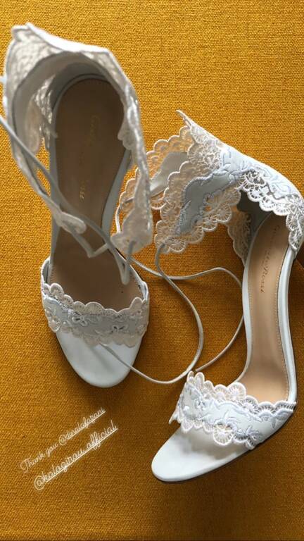 Η Τζένη Μπαλατσινού επέλεξε λευκά πέδιλα με δαντελένιες λεπτομέρειες.