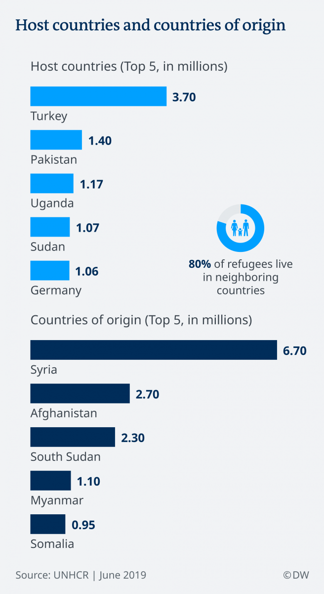 Παγκοσμίως οι χώρες με τους περισσότερους αναγνωρισμένους πρόσφυγες είναι πρώτη η Τουρκία με 3,7 εκ., ακολουθεί το Πακιστάν με 1,4 εκ., η Ουγκάντα με 1,17 εκ., το Σουδάν με 1,07 εκ. και η Γερμανία με 1,06 εκ. Μια διαφορετική εικόνα προκύπτει, αν θέσει κανείς τον αριθμό των προσφύγων σε αναλογία με τον εντόπιο πληθυσμό μιας χώρας.
