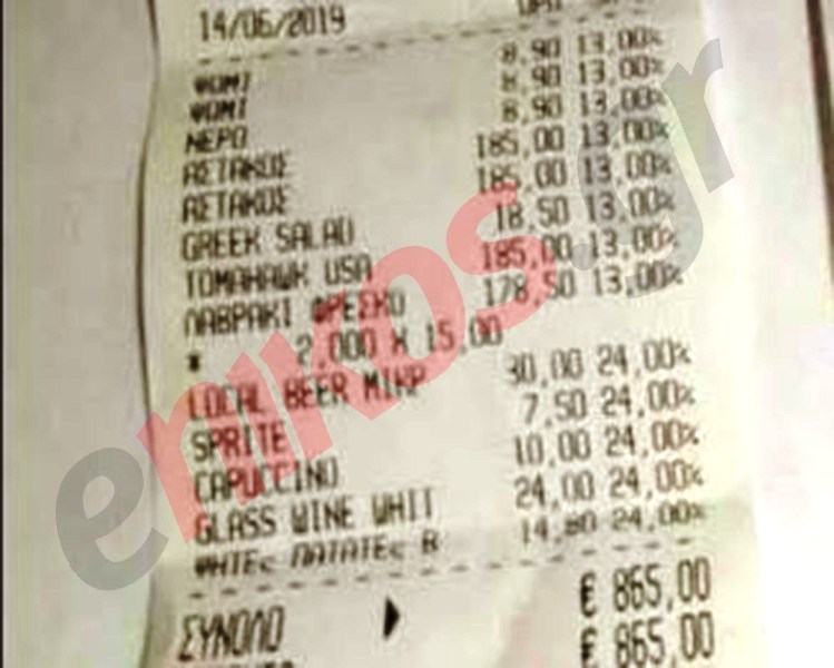 Στην πρώτη παρέα οι δύο αστακοί κόστισαν συνολικά 370 ευρώ, η σαλάτα 18,50 ευρώ, μία μπριζόλα Tomahawk USA 185 ευρώ και το φρέσκο λαβράκι 178,50 ευρώ. Η ίδια παρέα –μεταξύ άλλων- πλήρωσε 30 ευρώ για μία τοπική μπύρα και 24 ευρώ για ένα ποτήρι κρασί.