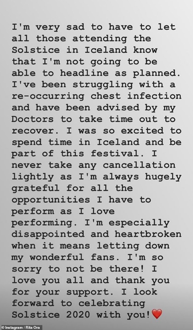 Η Rita Ora έγραψε στο Instagram: «Είμαι πολύ λυπημένη που πρέπει να ενημερώσω όλους όσοι παρευρίσκονται στο Ηλιοστάσιο της Ισλανδίας ότι δεν θα μπορέσω να εμφανιστώ όπως είχε προγραμματιστεί. Παλεύω με μια επανεμφανιζόμενη λοίμωξη στο στήθος και έχω ενημερωθεί από τους γιατρούς μου να τα ακυρώσω όλα για να ανακάμψει.